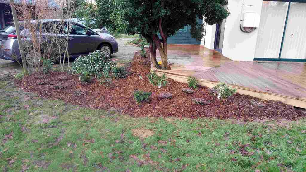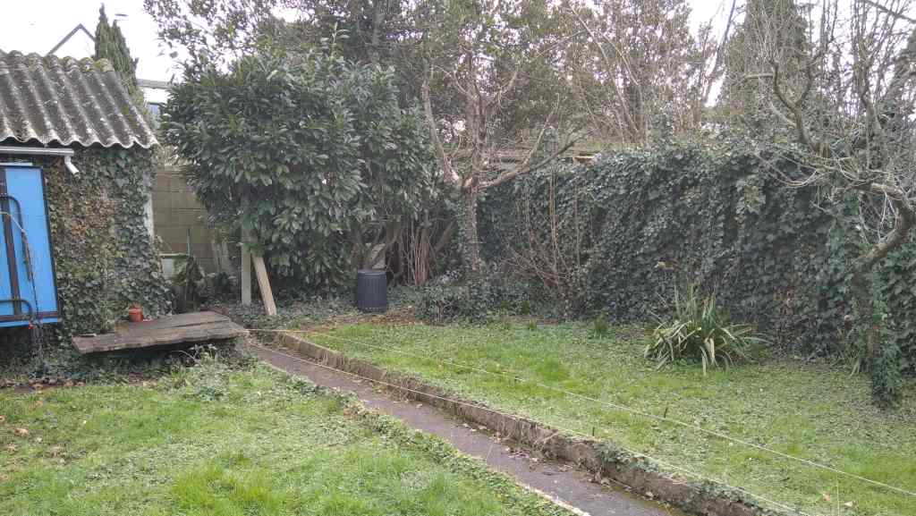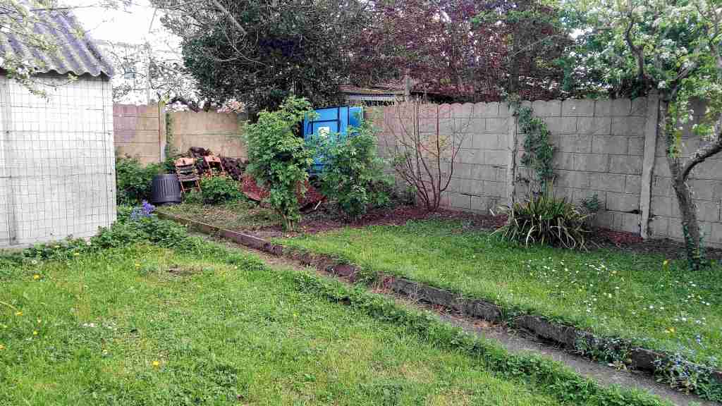 Dans ce jardin de centre-ville le lierre a été enlevé des murs, le béton a été évacué, les arbres ont été taillés et ont fourni le paillage pour les plantations : rosiers, sureau et orme. L’utilisation d’un broyeur étroit a permis de valoriser tous les déchets végétaux sur place et éviter ainsi beaucoup d’allers retour dans la maison.