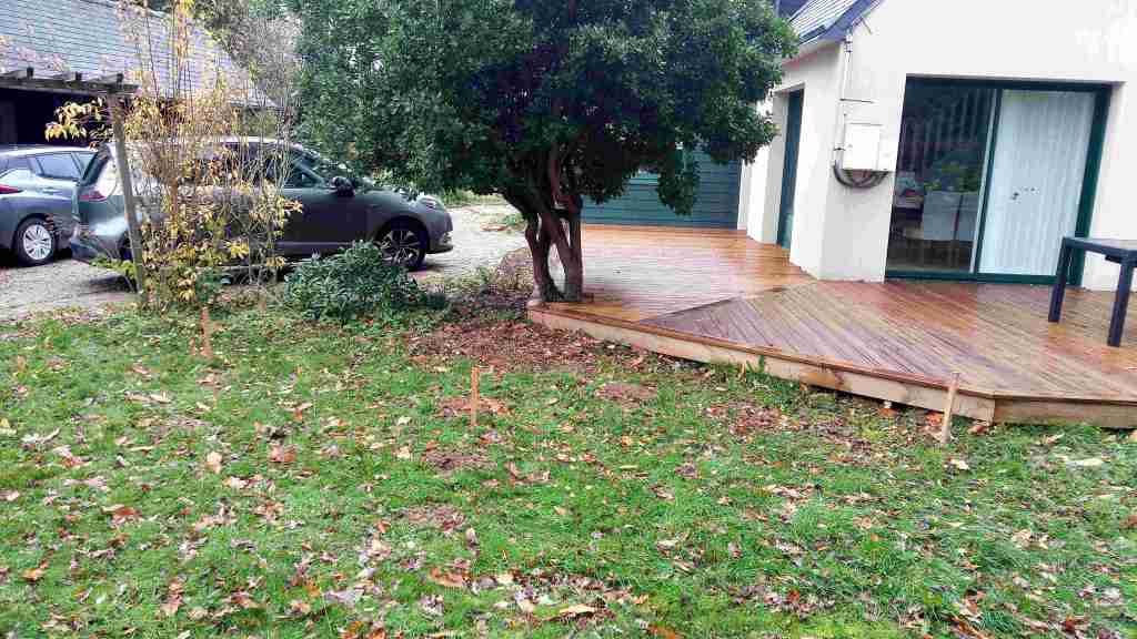 Dans celui-ci les plantations ont été faites après la construction de la terrasse pour la valoriser et créer une séparation avec le parking. Les plants ont été choisis jeunes pour garantir une meilleure croissance, des sujets âgés poussent plus difficilement après le grand stress de l’arrachage subit en pépinière et sont dépassés par les jeunes après quelques années seulement.