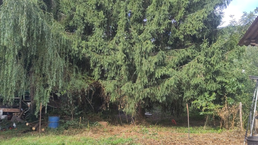 Voici l’élagage des branches basses des épicéas pour redécouvrir la vue sur les environs et avoir une meilleure luminosité dans le jardin. Ce chantier s’est fait en ayant installé une corde de rappel au dessus de la zone à tailler afin de ne pas endommager l’écorce des arbres.